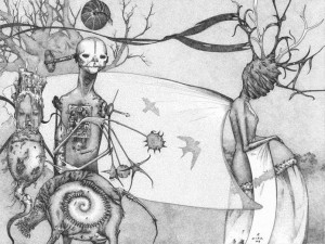 For instance, take Kirk’s The Dust Mill, which presents us with a Tim Burton-like vision of Father Time and Baby New Year. The baby’s human face is marred by all the candle wax dripping down like prison bars, yet that humanness is immediately undercut by the potato body and its sinuous root that seems to form a tail. Time itself is a serene, emaciated figure with branch-like arms that are barely screwed on. The huge key sticking out of its head hints that there is a stronger, more potent entity that actually controls it, and reinforces its expression as a being of time – like a wind-up toy or wristwatch. Yet the pen or paintbrush it cradles evokes the creative, narrative power of time itself — not time subservient to our definition concerning modes of production (appointment at 8 a.m., pick up laundry at 10:30, etc.). Perhaps it is not what we do with our time that is so important, but rather rethinking how we have constructed its passing. How would it be if we stopped dividing it into the mechanistic second, minute, or hour and instead read it as one long poem? Kirk dares us to look at time in such a way, outside of human history, for his work cannot be placed in the present, future, or past. Could we then apply that creativity and paradigm shift to our own mythology — reimagine the ice age as its own entity and ecosystem instead of always putting it within the construct of evolution, thus subtly making it a narrative subservient to our Western constructions? The pregnant female form to the right — residing in between animal, vegetable, and mineral— might indict us even more. The strange ribbon flowing out of Time’s pen wraps her face so that she is blind (perhaps she can no longer see the creative power of time, being so bound by it). Her head bursts with branches that resemble antlers and her cape fans out like wings so that compositionally, it has the most mass in the picture and spreads a kind of translucent light across the barren landscape. Time and the candle-covered baby stand together while the pregnant figure faces the other direction, blind and bound, head sunk low. Behind the cape, two birds fly towards her, but the only other animal, a stitched together hybrid, has turned away, its snout hanging dejectedly as it walks away. If the figure represents nature, what monstrous thing could she be giving birth to, that Time and his son must abandon her? Could it even be us?