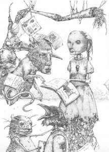 That narrative and visual distance can trap us within the realm of the grotesque — caught between human gaze and apocalyptic horror/humor. Within most of Kirk’s beautiful, deteriorating landscapes, there lies a subtle challenge for us to critically rethink our relationship to the elemental and animal kingdoms. Look for the bottle of poison jutting out from the flowers in Murder in the Court of the Katydid King; notice how Tragedy of Erroneous Pagination places dream and memory side by side as they are examined by the freaks of nature (human made, perhaps). Consider, then, Kirk’s use of these organic angels and mechanical hybrids as a warning bell that there might just be enough time to turn down another path before the nightmare of ecological disaster becomes a reality.